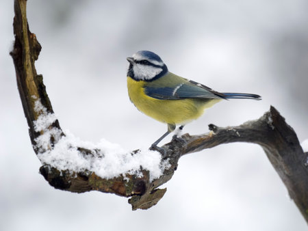 Eurasian blue tit (Cyanistes caeruleus) sitting on a branch in winter.
