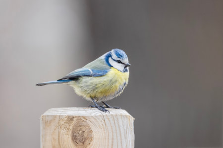 A blue tit (Cyanistes caeruleus) sitting on a piece of wood eating