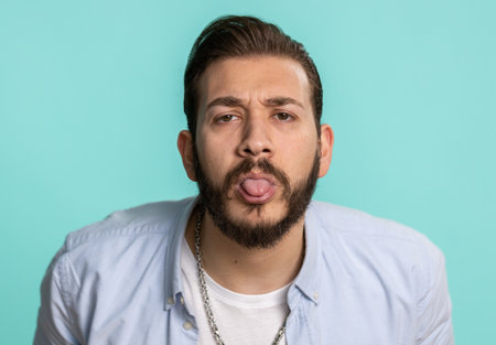 Cool bearded man with long hair sticking his tongue out and looking at camera against blue wall.