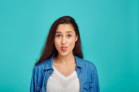 lose-up Photo Of A Woman Showing Tongue on a blue studio background