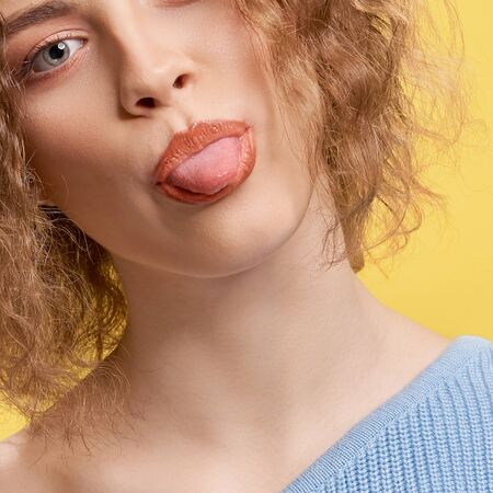 Closeup of bright young woman looking at camera and showing tongue on yellow isolated background. Short haired curly girl posing and smiling in studio. Concept of happiness and children.