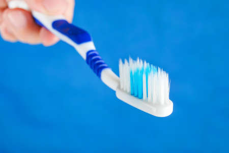 damp toothbrush on a blue background, close up
