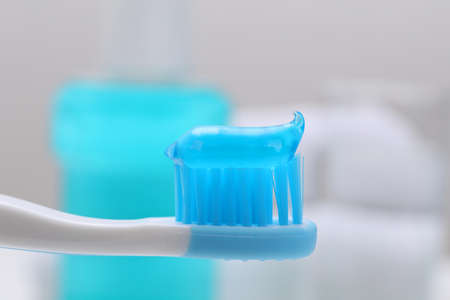 Toothbrush with paste on blurred background, closeup