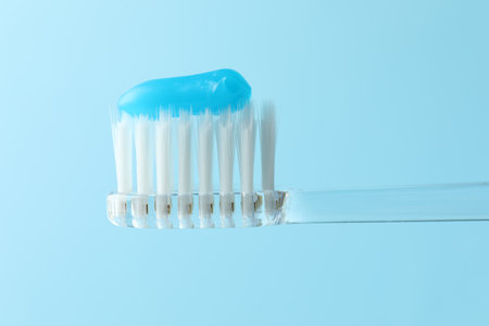 A high-quality image showcasing bright blue toothpaste on a white toothbrush, set against a soft blue backdrop, perfect for promoting oral hygiene and dental care.