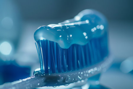 Extreme close-up of a toothbrush with blue toothpaste, highlighting the bristles and the texture of the toothpaste.