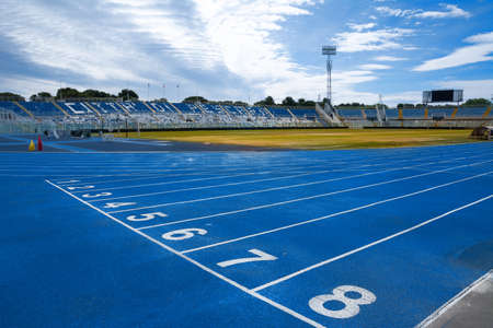 Blue running track at the stadium with numbers from one to eight. Starting area at the stadium. High quality photo