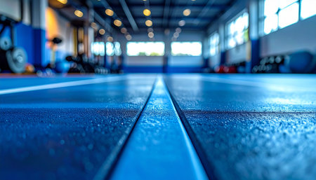 A detailed, low-angle shot of a blue gym floor with a prominent white line, blurring into a sunlit gym interior with equipment.