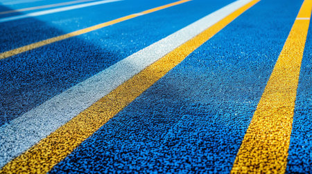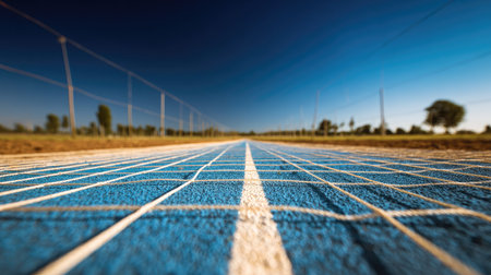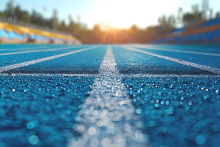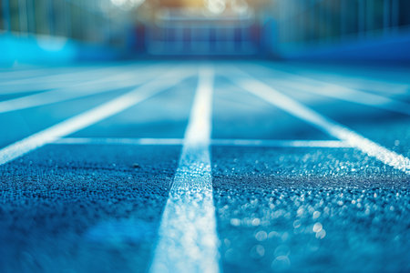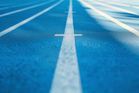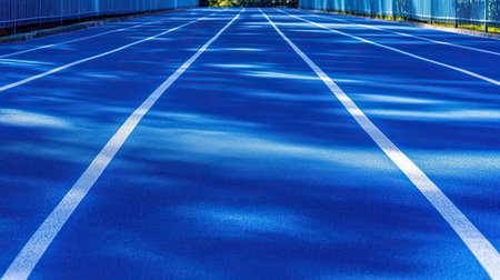 A vibrant blue running track stretches out with bright lanes and soft shadows. The clean surface suggests perfect conditions for athletic activities and competitions.