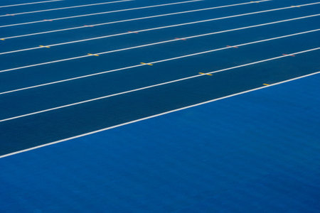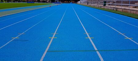 Blue track and field lanes. Running lanes at a track and field athletic stadium. Horizontal sport theme poster, greeting cards, headers, website and app