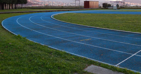 Running track in blue and white with green grass outdoor. Sport outdoor and fresh air. Galicia. Spain. Europe.