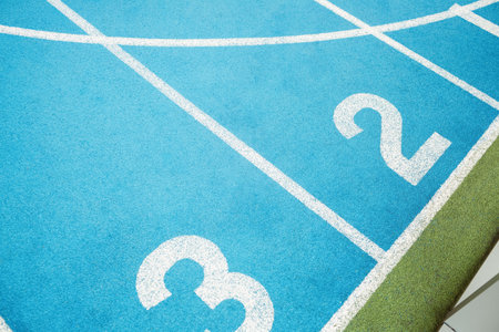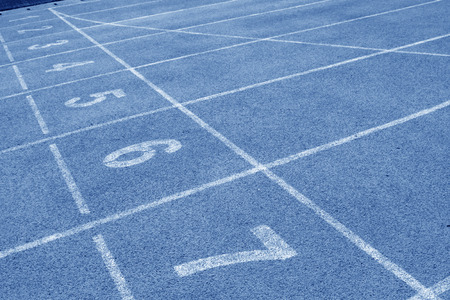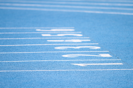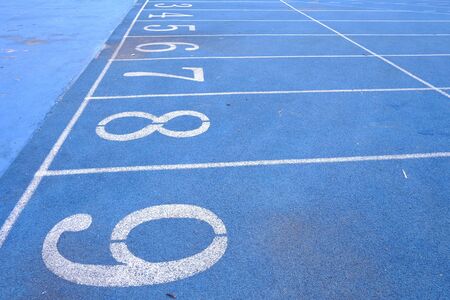 The running track lane with painted numbers on the ground and white lines,blue color floor for background texture