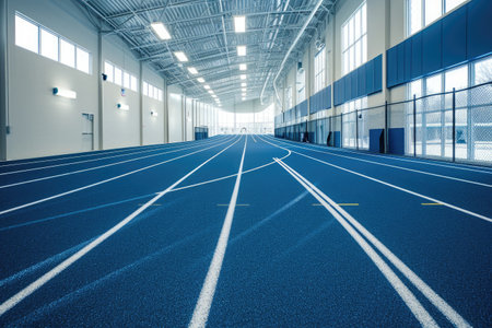 An empty indoor track inside a vast building with a sleek design, ready for athletes to train, An indoor gym track for runners, AI Generated