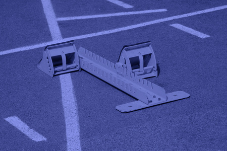 Starting blocks on the starting line of the track and field at the stadium