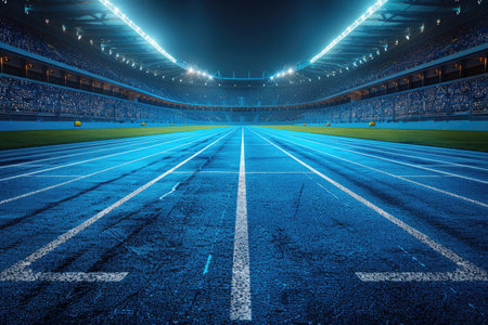 A captivating view of an empty athletic track scene featuring starting blocks, illuminated by stadium lights, evoking the excitement of upcoming competitions.