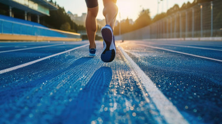 Dynamic image capturing an athlete's running shoes on a vivid blue racing track, highlighting speed and competition