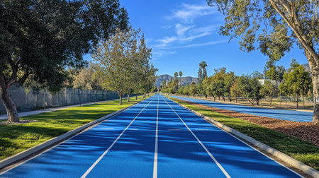 A vibrant blue running track stretches into the distance, dappled with shadows from overhead trees, creating a serene yet energetic atmosphere for athletes.