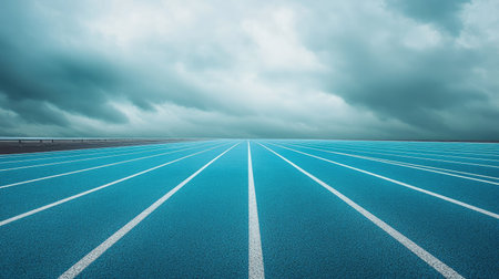 Minimalist image of running track lanes under a soft overcast sky, focusing on simplicity and structure.