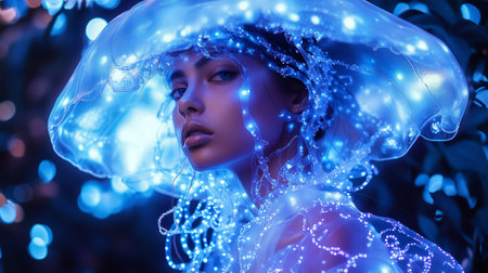 A young woman adorned in glowing blue lights stands in a lush garden at twilight, exuding an ethereal and captivating charm