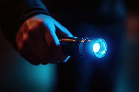 Close-up of person holding a flashlight emitting blue light in dark setting, dramatic lighting emphasizes the hand and beam.