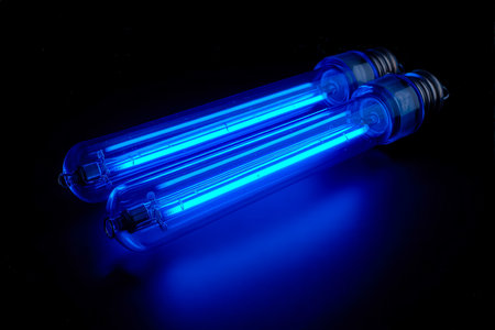 Two luminous blue ultraviolet bulbs rest on a dark surface, casting an eerie glow that highlights their delicate glass contours and futuristic appeal.