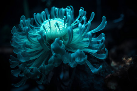 Radiant blue flowers illuminate the darkness, showing mesmerizing details and sparkling accents.
