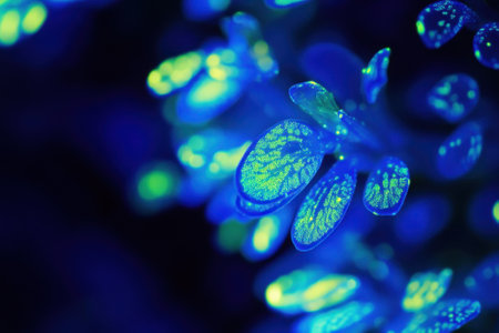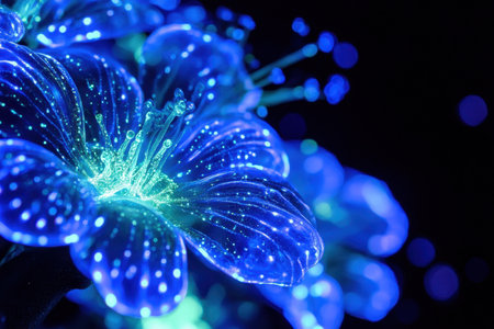 Lush blue foliage illuminates with luminous patterns against a dark backdrop, creating a mesmerizing effect.