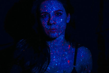 Under mesmerizing blue lights, a woman portrays grace with her hair dancing around her. The atmosphere captures a moment of tranquility and artistic expression, leaving a lasting impression.
