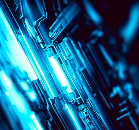 This vibrant abstract close-up features glowing blue neon tubes intertwined in a chaotic yet captivating design, perfect for tech and energy themes.