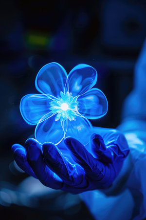 A person is holding a blue flower in their hand. The flower is glowing and he is a hologram. Concept of wonder and fascination with the technology used to create the flower