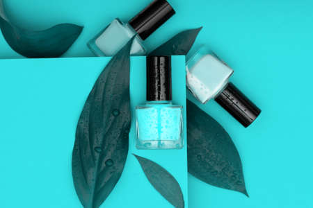 Three nail polish bottles on blue background. Nail polish bottles decorated with green leaves.