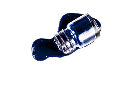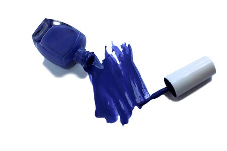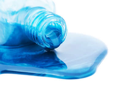 Bottle with blue spilled nail polish isolated on white background