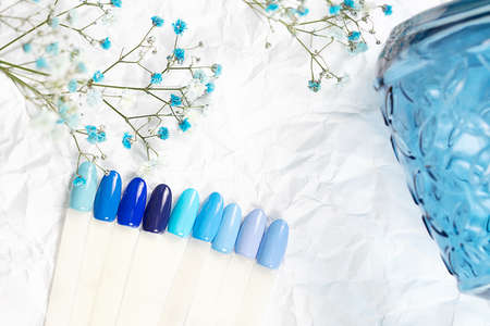 Different blue nails polish manicure palette Background. Samples of nail varnishes.