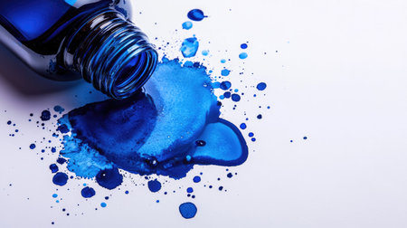 Vivid blue ink spilling from a bottle, creating organic shapes and patterns on a flat surface.
