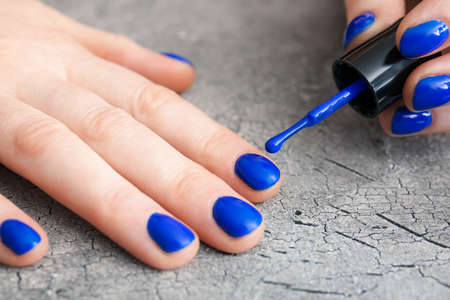 Girl paints her nails with blue nail polish