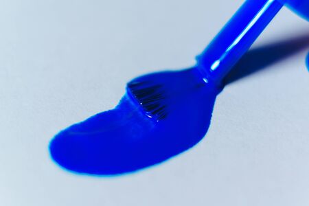 Blue colored poster water color bottle fallen or dropping on white surface or background.