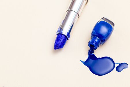 Lipstick with blue sparkles and blue nail polish. Color 2020. Copy space