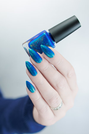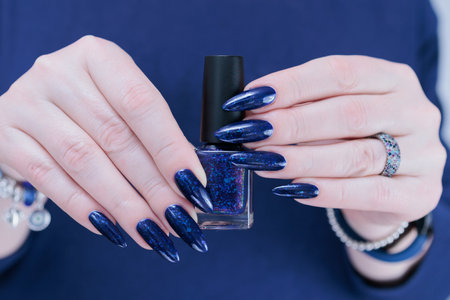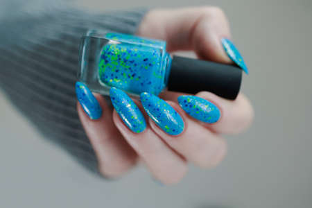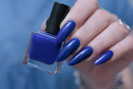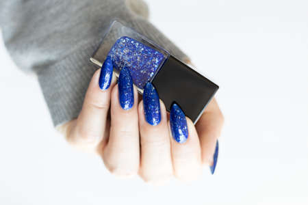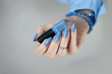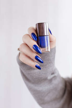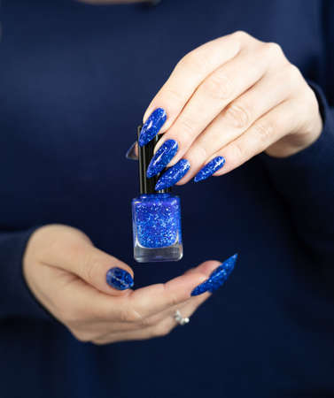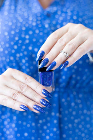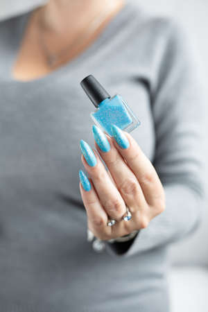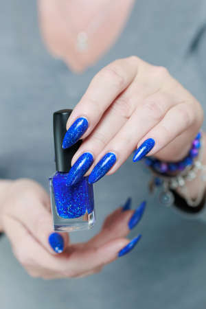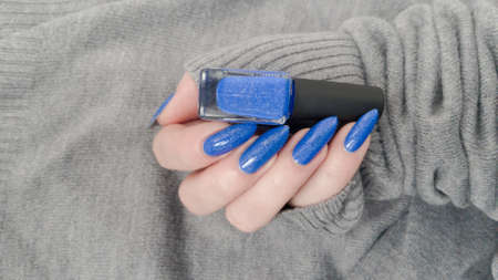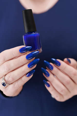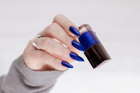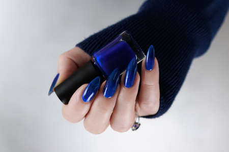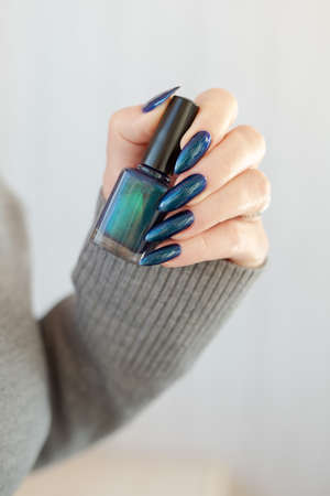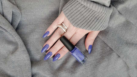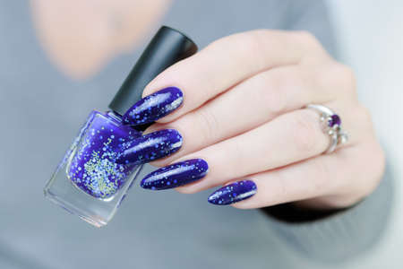 Female hand with long nails and purple blue manicure holds a bottle of nail polish
