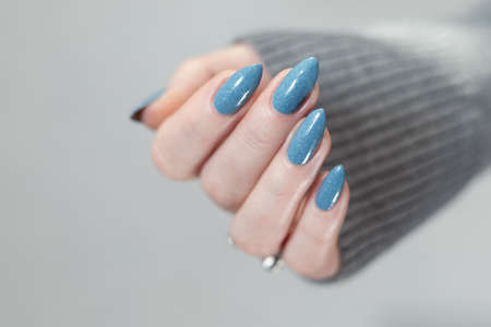 Woman's beautiful hand with long nails and light blue manicure