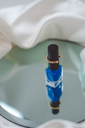 Nail polish in a blue bottle on a mirror with white fabric