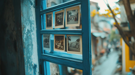 A charming display of vintage photographs arranged in a blue window frame, showcasing the rich history and culture of a narrow street, set against a blurred background.