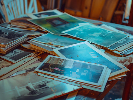 Warmly lit hands gently hold a treasured photograph, surrounded by a nostalgic collection of old images, evoking memories of cherished moments.