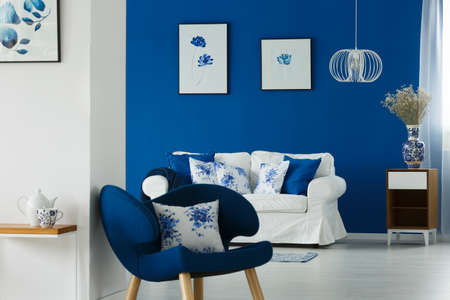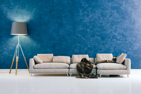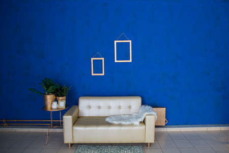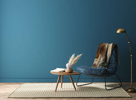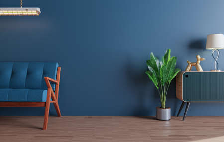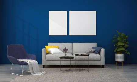 minimal interior style poster Mock up the living room wall in blue with modern sofa and decorations in the living room.