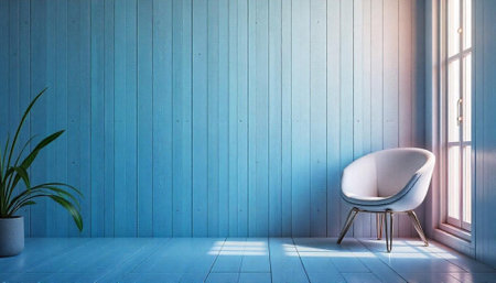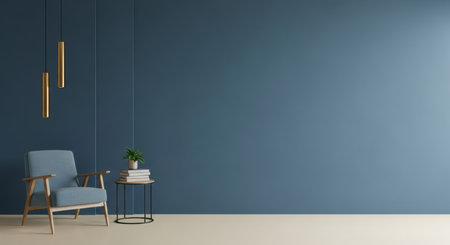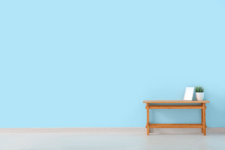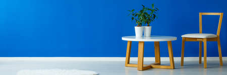 Painted deep blue wall with single houseplant on wood flower stand. Lot of copy space for text.