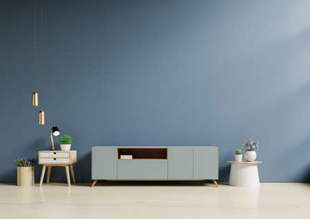 Cabinet TV in modern empty room with behind the dark blue wall.3d rendering