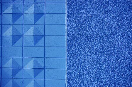 Fragment of the corner of the plastered facade of the building. Converging walls are blue and grey. The surface has a decorative texture. background.