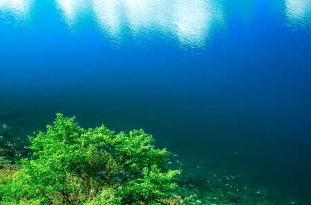 Reflections of a blue sky in a crystal clear water. Natural texture, background, graphic resources. Nature, environment, summer vacations, beach theme. Tranquility, purity, meditation concepts