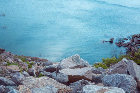 Natural stones on the shore of a lake at dusk. Tranquil scene, relaxing calm, zen meditation background.