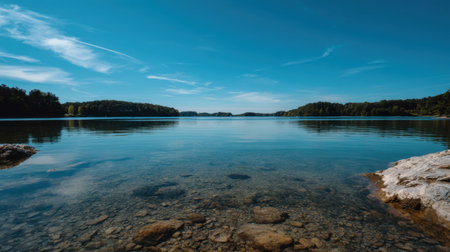 A tranquil scene showcasing a vast water body under a clear blue sky, surrounded by lush greenery, perfect for evoking feelings of peace and harmony.