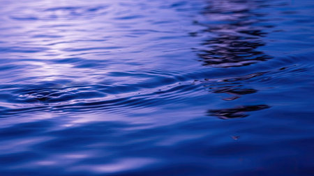 Texture of purple calm water of mountain lake. Meditative ripples on water surface. Nature minimal background of violet lake. Natural backdrop of clear dark blue water. Full frame of lake fragment.