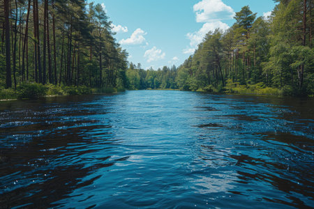 A stunning view of a tranquil river bordered by lush forests under a vibrant blue sky. The calm waters reflect the surrounding beauty, creating a serene atmosphere.